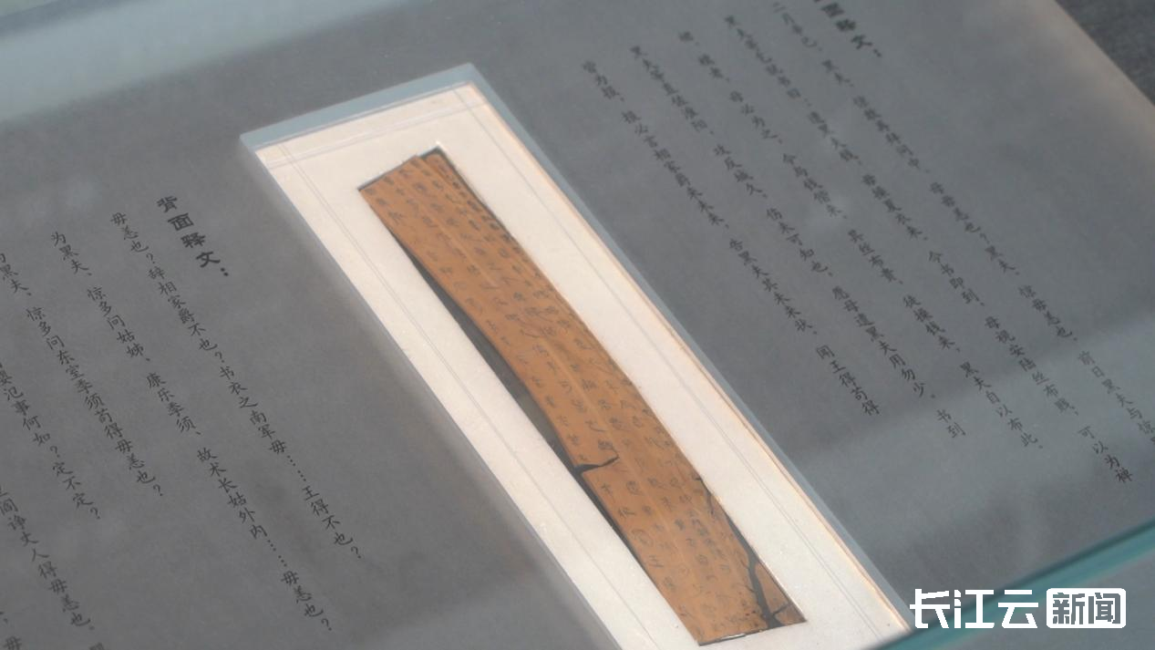 除了简牍,展馆还展示了漆器、木板画等文物。习近平总书记一次次在文物前驻足、凝视。郑家湖墓地出土的“中华第一文觚”,经过修复后真空保存在馆内,上面的文字清晰,可读、可辨。总书记仔细阅读了全文。