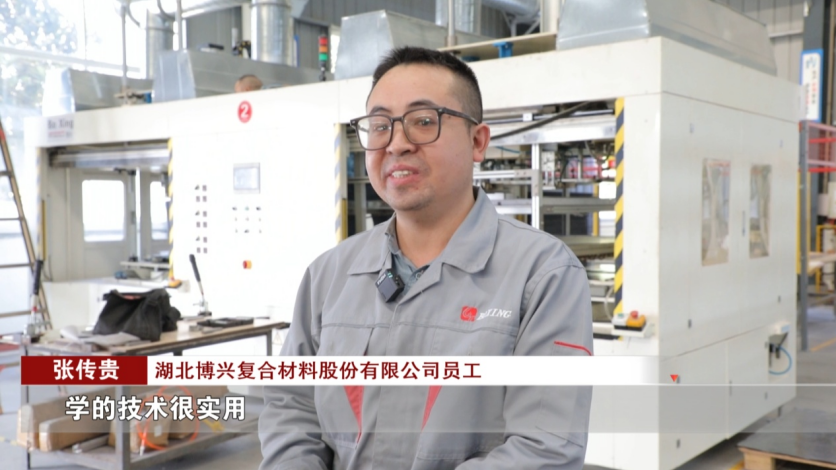 湖北博兴复合材料股份有限公司员工 张传贵:“我觉得我在十堰市劳动就业培训中心,学的技术很实用,在那里打下了坚实的基础,没有这个基础的话,是做不了这个工作的。”