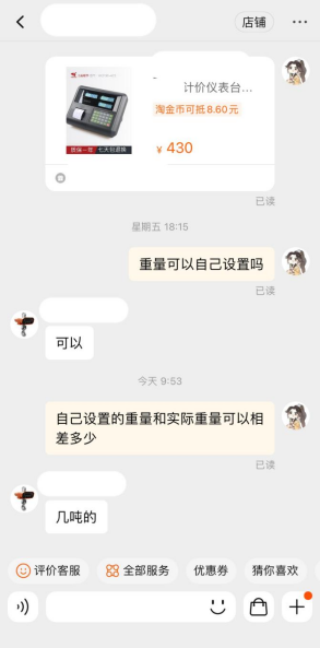 记者发现,在收银台与称重仪器之间,地面上有一台电话座机大小的黑色“称重显示控制器”。记者在某购物平台搜索到同款控制器,客服表示“重量可以自己设置”,而且自己设置的重量与实际重量可相差“几吨”。