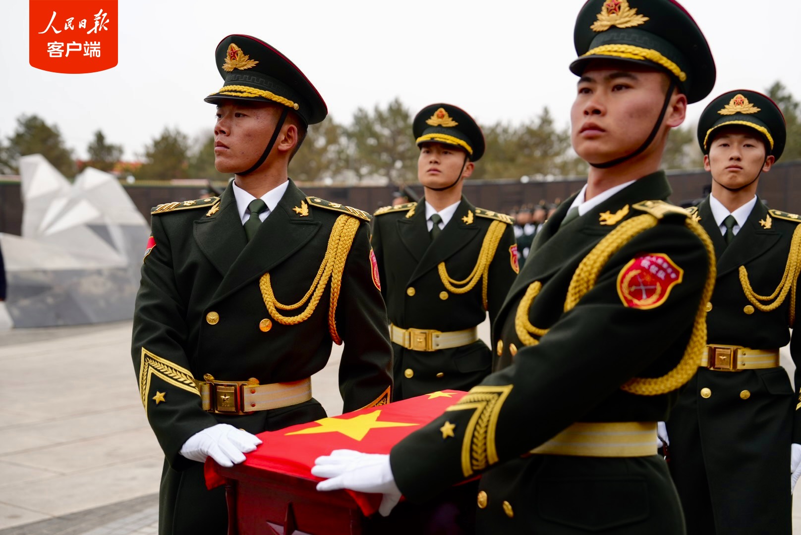 安葬仪式上,军乐队奏响《思念曲》,在解放军战士持枪护卫下,礼兵护送志愿军烈士棺椁缓缓步入现场。网友:无声的礼步看哭了!