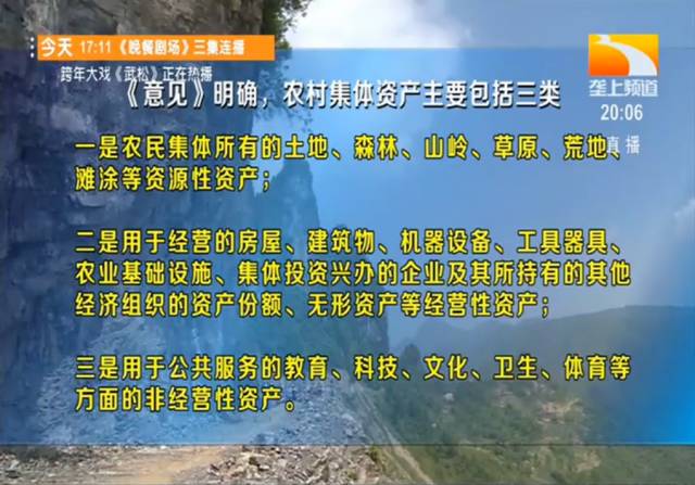 《意见》明确,农村集体资产主要包括三类:一是农民集体所有的土地、森林、山岭、草原、荒地、滩涂等资源性资产;二是用于经营的房屋、建筑物、机器设备、工具器具、农业基础设施、集体投资兴办的企业及其所持有的其他经济组织的资产份额、无形资产等经营性资产;三是用于公共服务的教育、科技、文化、卫生、体育等方面的非经营性资产。