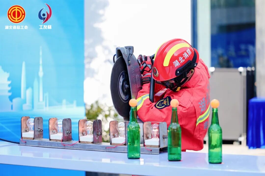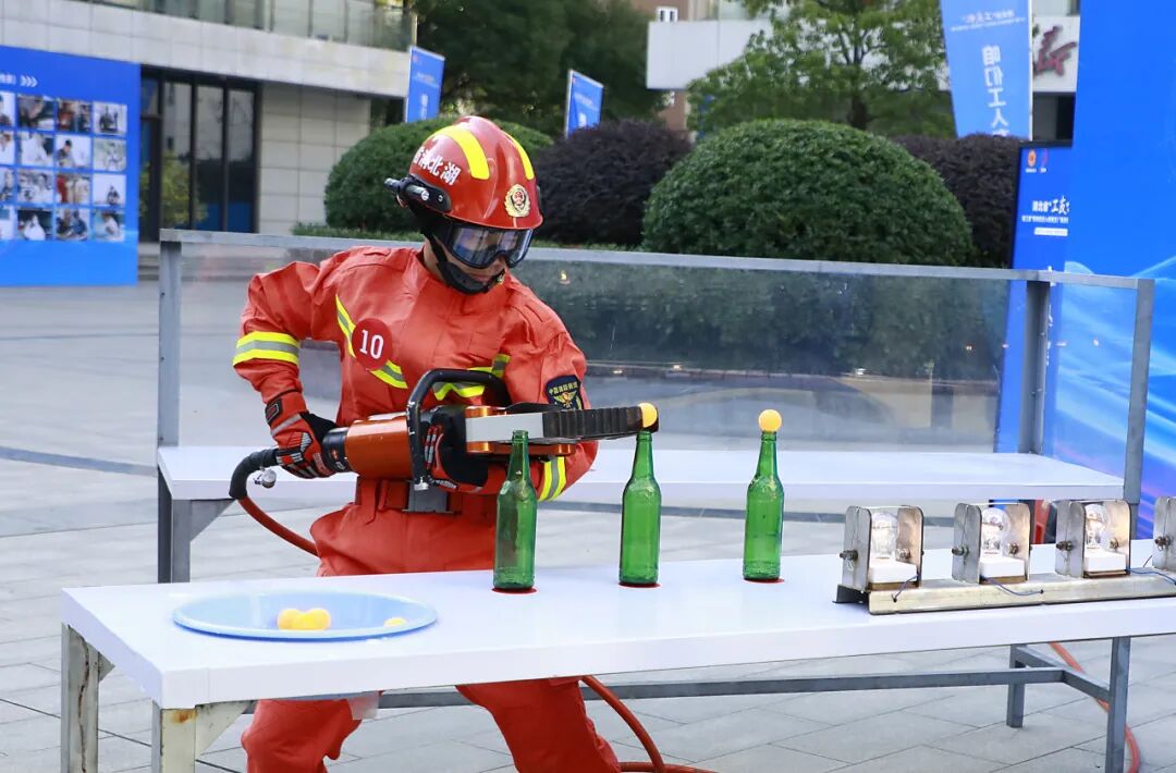 使用30多吨扩张力的消防液压钳夹起乒乓球放在啤酒瓶口上,乒乓球与酒瓶无损伤;使用无齿锯切割钢丝而不伤及下方脆弱的灯泡。