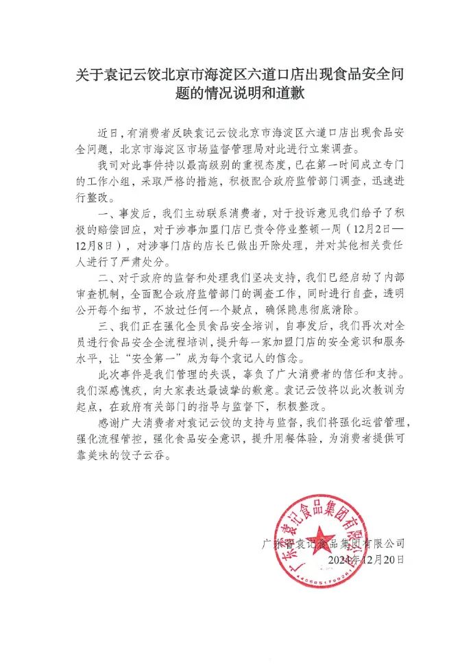 此次事件是我们管理的失误,辜负了广大消费者的信任和支持。我们深感愧疚,向大家表达最诚挚的歉意。袁记云饺将以此次教训为起点,在政府有关部门的指导与监督下,积极整改。”
