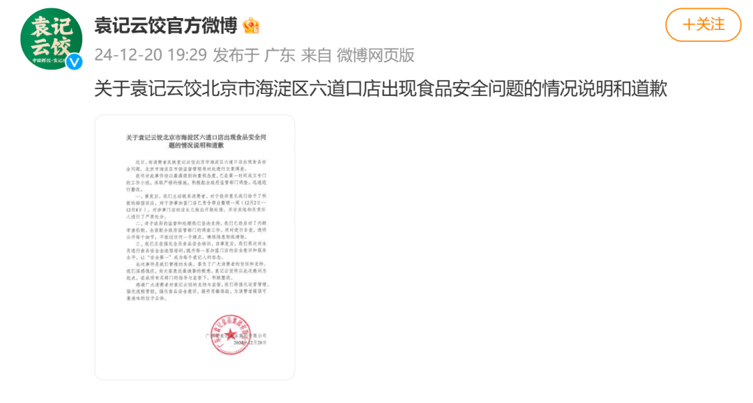 12月20日,广东省袁记食品集团有限公司@袁记云饺官方微博 发布“关于北京市海淀区六道口店出现食品安全问题的情况说明和道歉”。