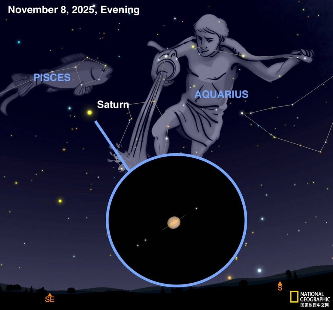 2025年11月8日夜晚,土星落在双鱼座和水瓶座之间。|绘图:ANDREW FAZEKAS