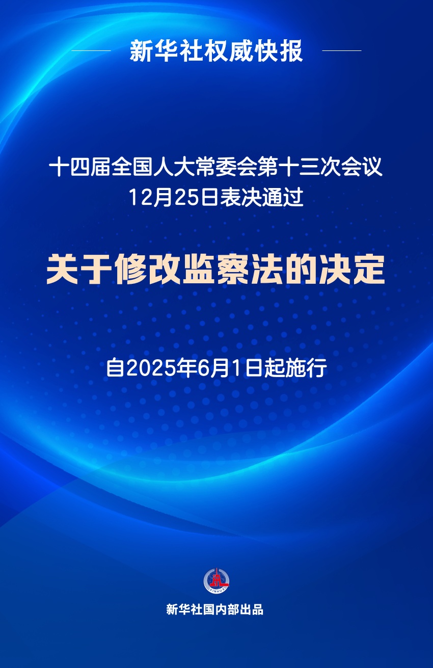 12月25日,十四届全国人大常委会第十三次会议表决通过关于修改监察法的决定,自2025年6月1日起施行。