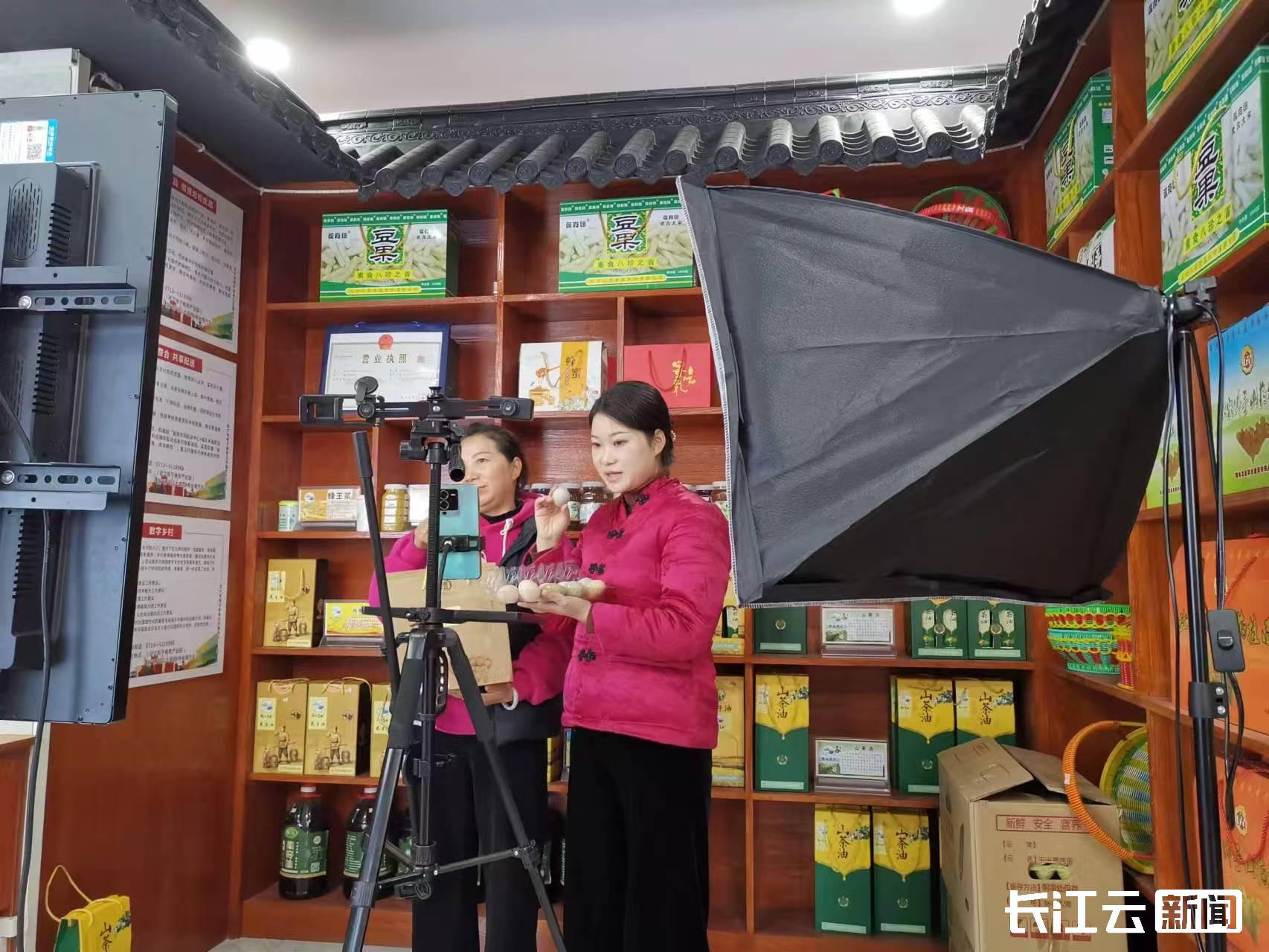 在黄冈武穴市大法寺镇上桂村,“90后”网络主播“花香为媒小丽”桂丽丽正对着手机介绍武穴年货好物。