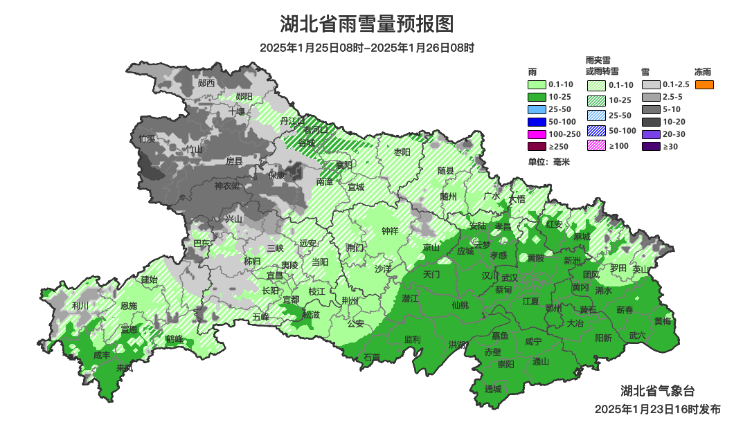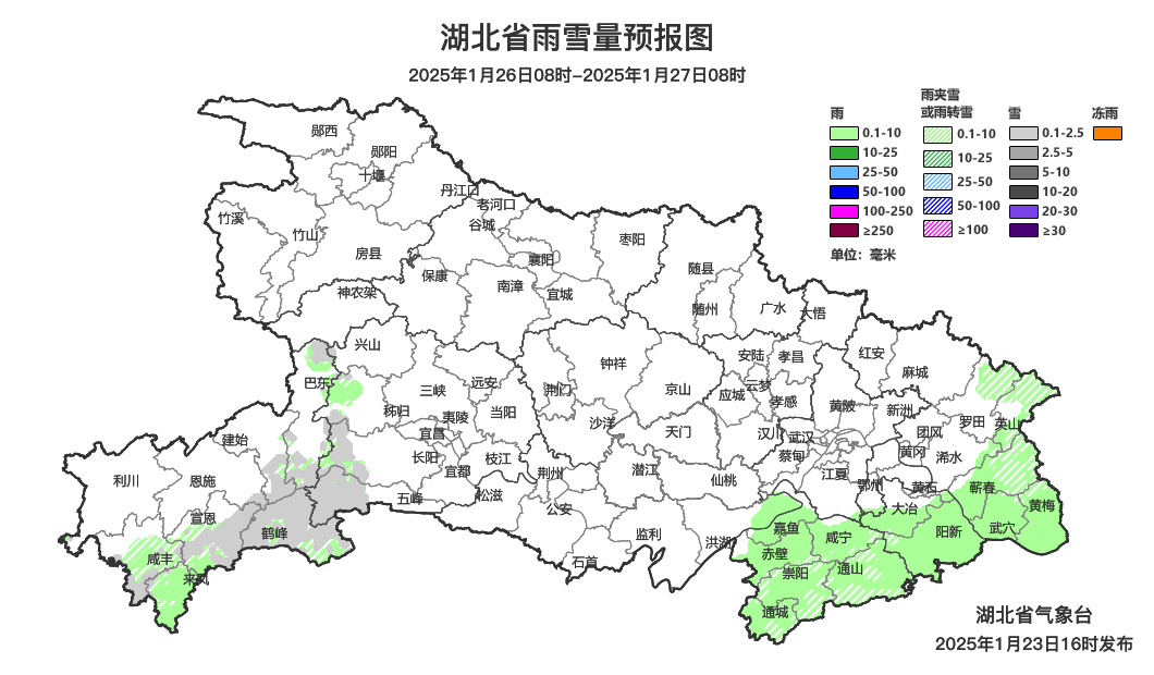 雨雪:24-26日全省小到中雨,局部大雨,西部和北部有雨夹雪或雪(高山地区中到大雪、局地暴雪)。预计24-25日上午前,降雪区主要位于鄂西北,25日下午开始逐渐向东扩。26日南部还有小雨雪残留,其他地区阴天转多云。