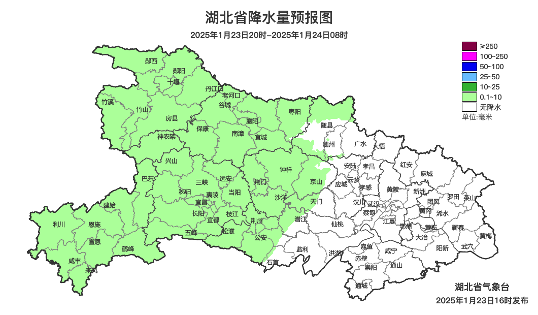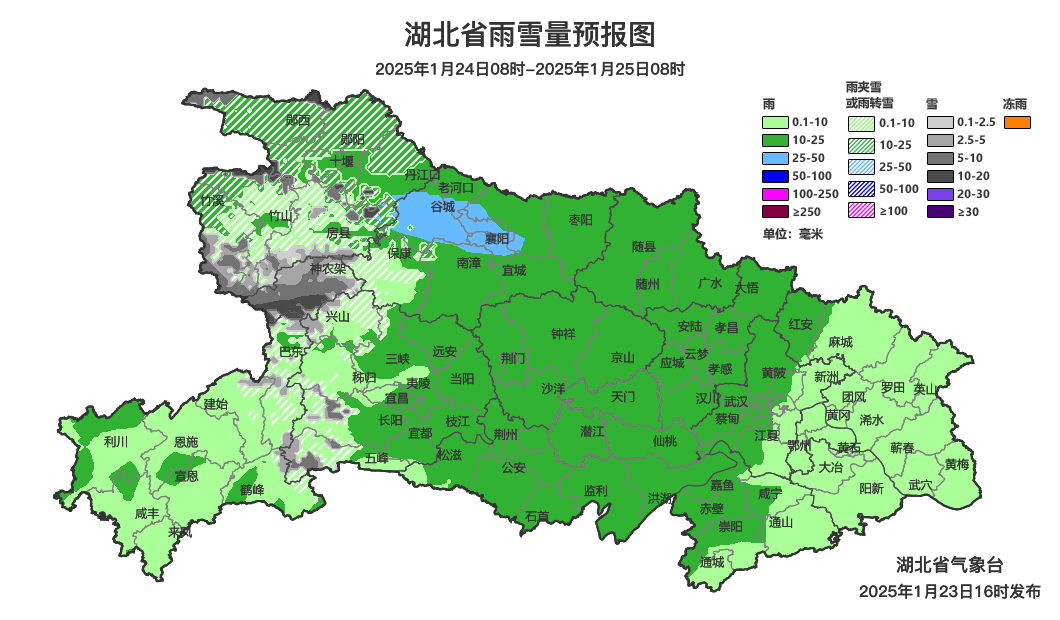 1月24日08时-25日08时,鄂西北、鄂西南、江汉平原、鄂东北北部阴天有小到中雨、局地大雨,其中鄂西北山区有雨夹雪或雪,高山地区中到大雪、局地暴雪;其他地区阴天转小到中雨。最高气温西部6~10℃、东部10~15℃,最低气温西部2~6℃、东部6~9℃,偏北风3到4级、阵风5到7级。