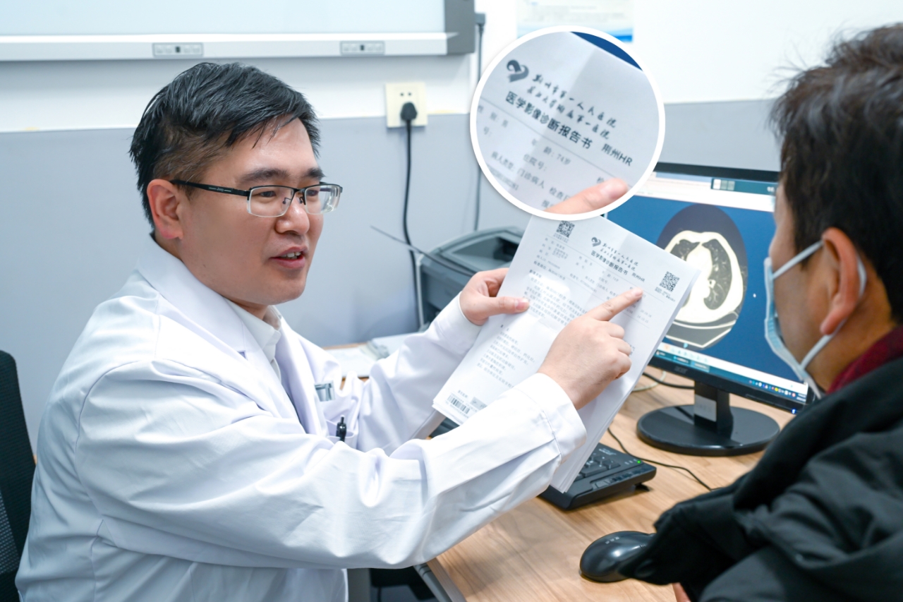 荆州一医新城院区肿瘤科医生与患者交流,介绍标有“HR”的检查单可以进行检验检查结果互认。