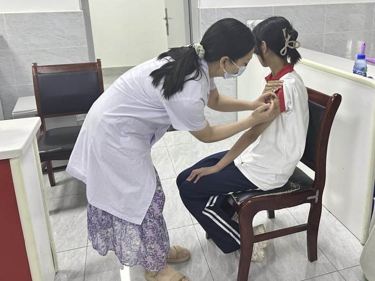 天门市侯口社区卫生服务中心为14岁女生免费接种2价HPV疫苗。