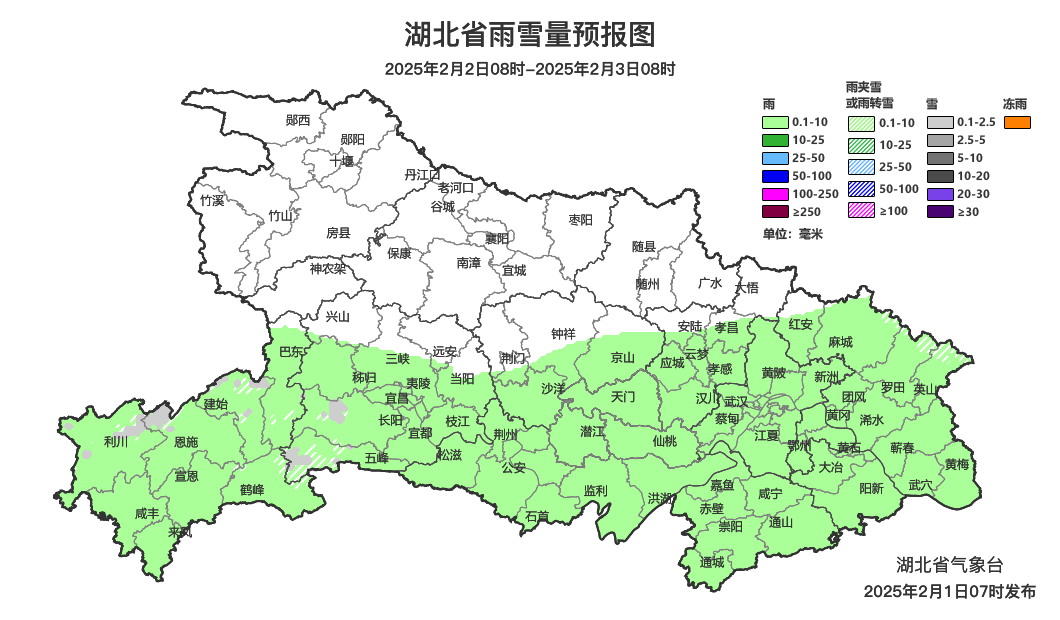 据湖北省气象台最新预报,今天(1日)鄂西北、鄂西南的高海拔地区仍有雨夹雪或雪,其他地区以雨为主。2日,雨雪天气减弱结束。
