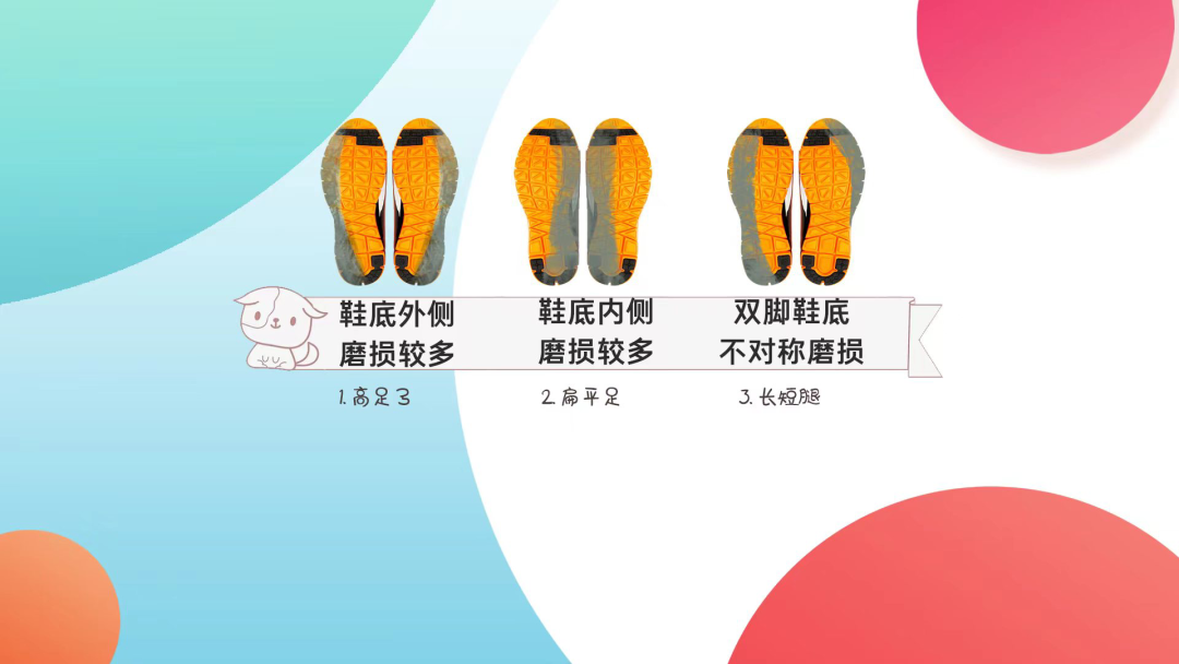 扁平足——主要特征即足弓降低或消失,足跟外翻,除了鞋底内侧会出现异常磨损外,鞋底中间也会出现磨损。