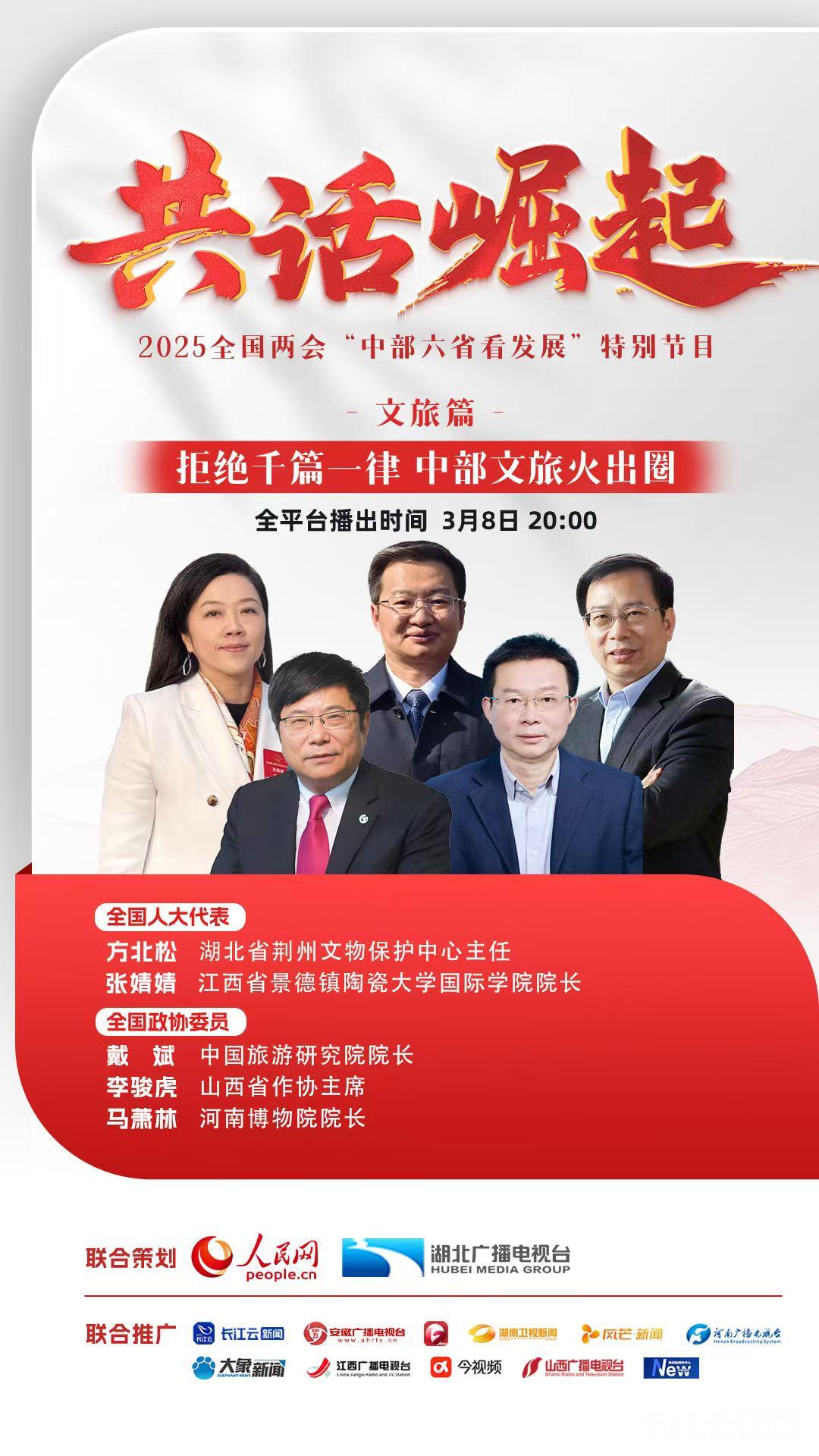 今年全国两会,人民网、湖北广播电视台联合策划“中部六省看发展”特别节目《共话崛起》,第二期聚焦文旅,来自湖北、山西、河南、江西的四位代表委员以及权威专家,共话中部地区文旅高质量发展。