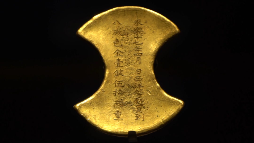 “梁庄王墓中出土的大量异域珠宝,极有可能来自如今的南亚和东南亚地区,比如印度、斯里兰卡等地。”湖北省博物馆讲解员崔航娓娓道来,“其来源大概率是当时的朝贡贸易,随后被皇帝赏赐给了梁庄王。我身旁的这件金锭便是有力的佐证。按照明朝礼制规定,亲王的定亲礼物中应有金五十两。这块金锭上錾刻着‘永乐十七年四月日西洋等处买到八成色金壹锭伍拾两重’的铭文。铭文中的‘买到’二字,明确表明了获得金料的方式为贸易。在这块金锭出土之前,没有任何文物能够证实郑和在西洋采买过黄金,它的出现,恰好填补了这一重要的历史空白。”