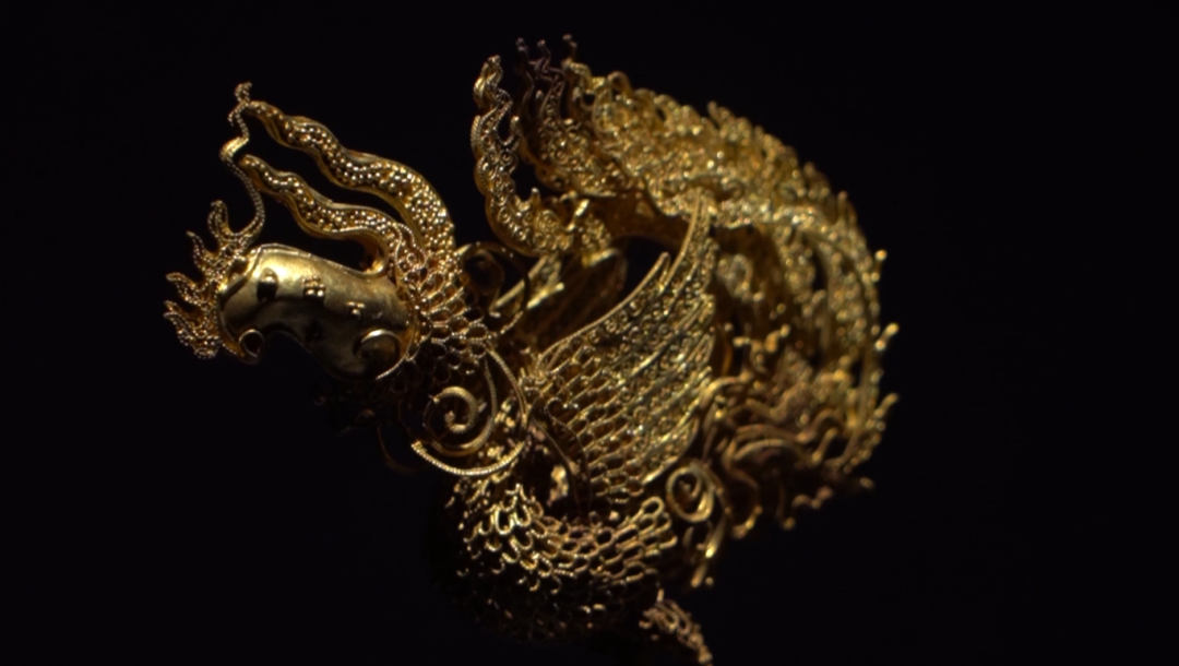 在明代女性的发型搭配中,一套完整的头面组合极为讲究,包含 “挑心”“分心”“满冠”“掩鬓”“鬓钗”“花头簪” 等。而这对金凤簪,常常被王妃插于发髻两侧,为她增添了无尽的雍容华贵。梁庄王墓出土的首饰,大多采用了金累丝工艺,这一工艺源远流长,起源于春秋战国时期的错金银工艺。能工巧匠们凭借着精湛的技艺,运用掐、填、錾、焊、编织等一系列传统技法,将金银铜巧妙地拉制成细丝,再将这些细丝精心编成股、辫股或网状组织。其中,立体累丝工艺堪称工艺之巅,难度极高,制成的成品巧夺天工,规整有序又尽显富丽堂皇。