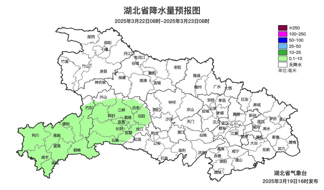 3月22日08时-23日08时,鄂西南多云转小雨;其他地区晴天转多云。最高气温恩施地区14~18℃、其他地区24~28℃,最低气温8~13℃,偏南风2到3级。