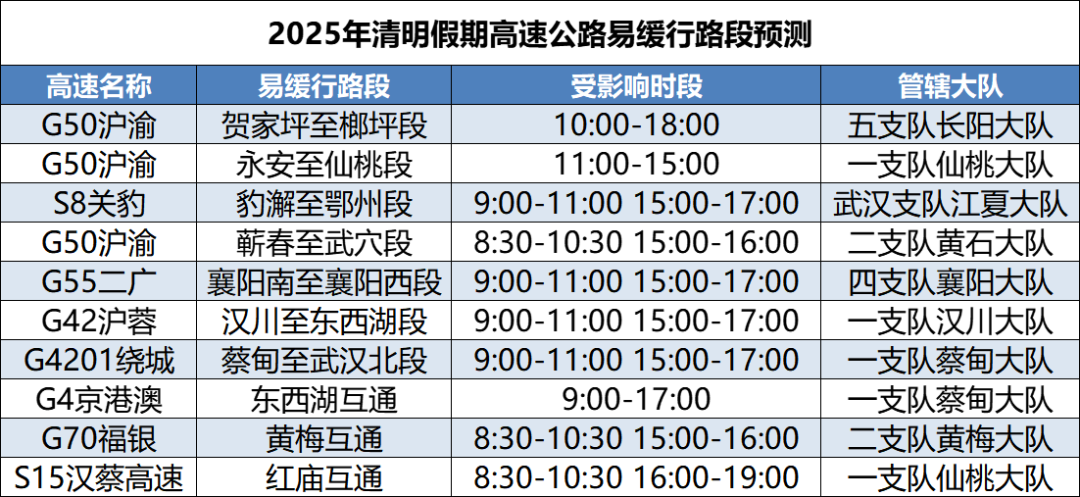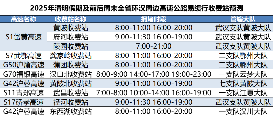 G50沪渝高速仙桃、鄂州、长阳、黄石段,G4201武汉绕城高速江夏、蔡甸段,G4京港澳高速孝感段,G70福银高速云梦段,G42沪蓉高速汉川、黄陂段,S7武鄂高速,G4221沪武高速江岸、罗田段,S1岱黄高速,S8关豹高速江夏段,G55二广高速荆门、襄阳段等高速拥堵风险高。