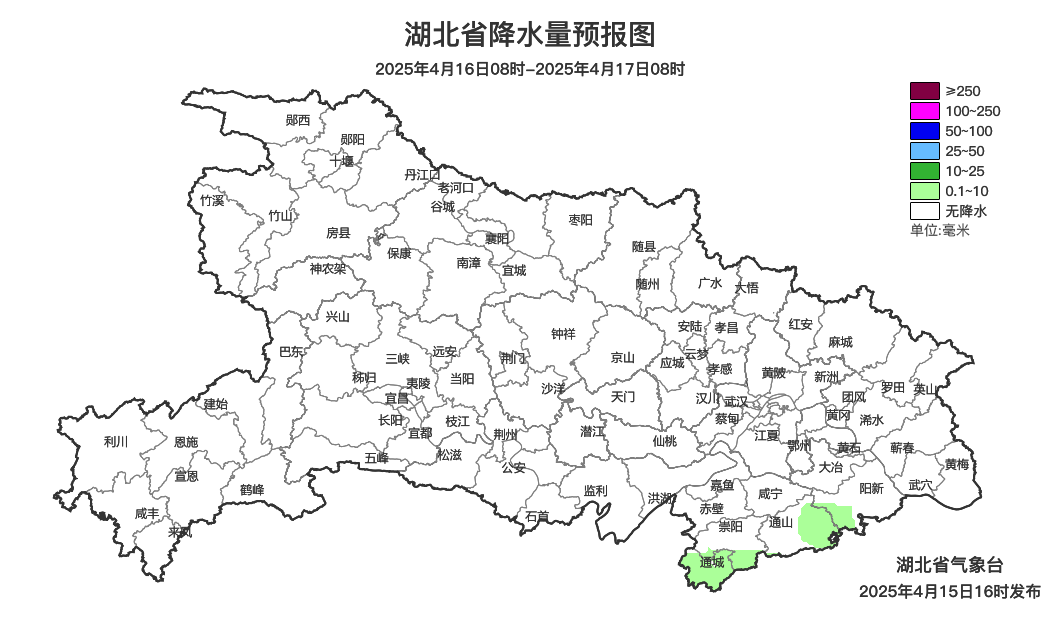 4月16日08时-17日08时,湖北全省多云,其中鄂东南南部局地有阵雨或雷阵雨。最高气温鄂西北30~35℃、其他地区26~30℃,最低气温西部11~15℃、中东部15~19℃,偏南风3到4级、阵风5到6级。