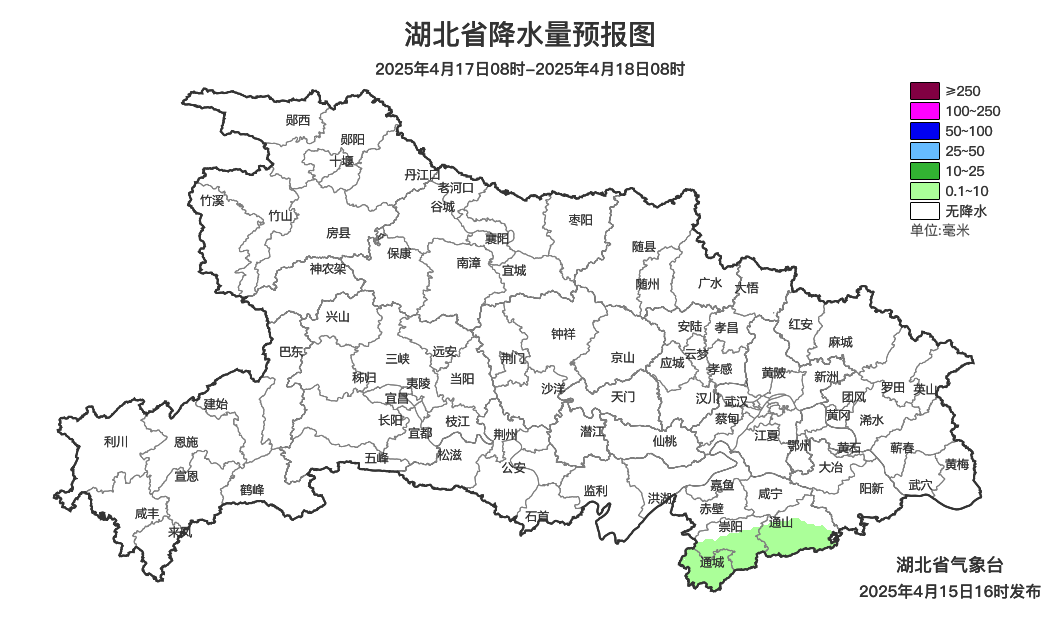 4月17日08时-18日08时,湖北全省多云,其中鄂东南南部局地有阵雨或雷阵雨。最高气温西部32~36℃、中东部27~31℃,最低气温西部13~17℃、中东部17~21℃,偏南风3到4级、阵风5到6级。
