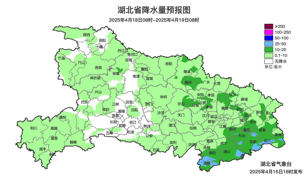 4月18日08时-19日08时,鄂东南多云转小到中雨,局地大雨;其他地区多云,午后有分散性阵雨或雷阵雨。湖北省内局地有雷暴大风等强对流天气。最高气温30~35℃,最低气温16~21℃,偏南风转偏北风3到4级、阵风5到6级。