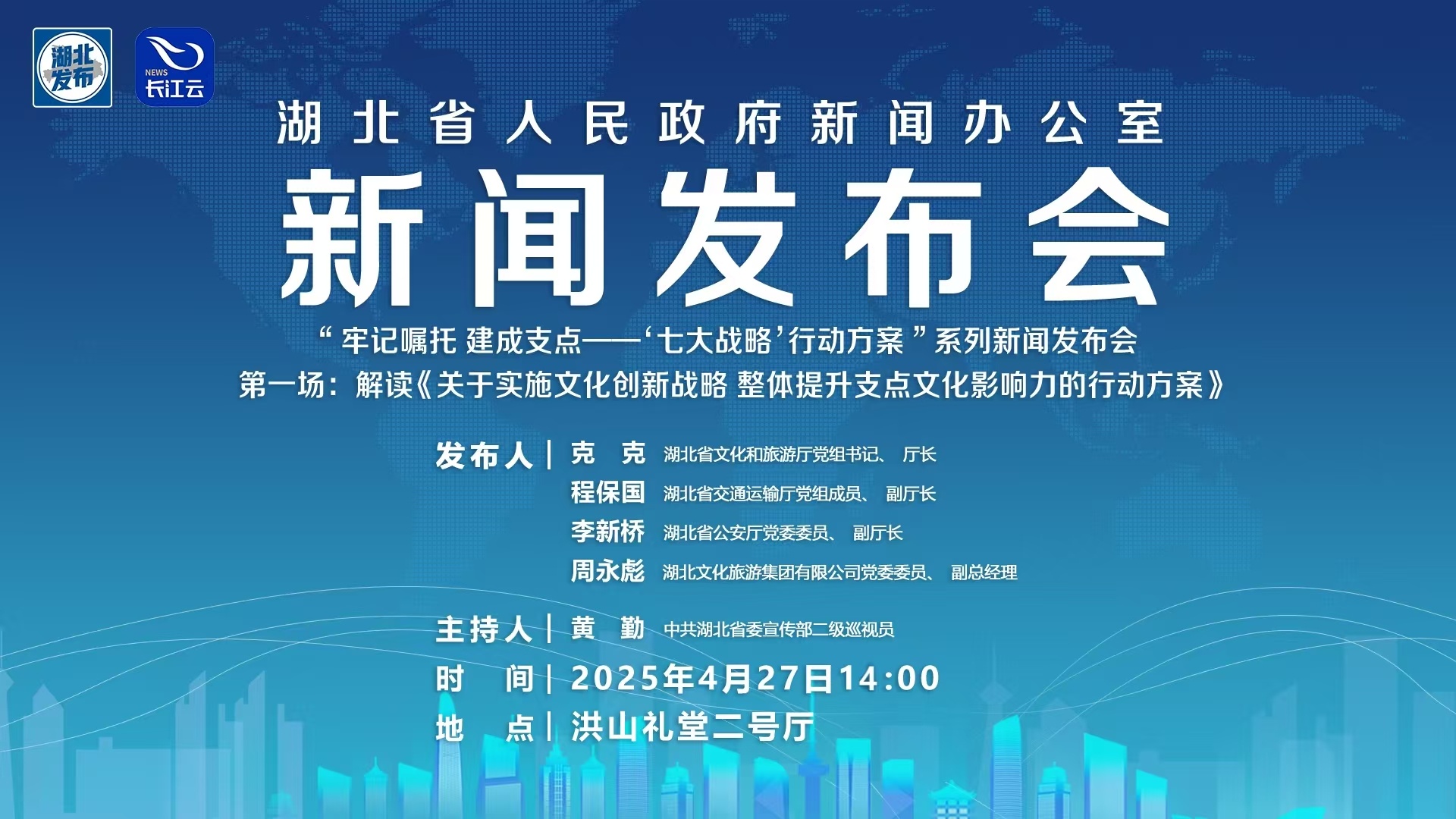 4月27日14:00,湖北召开“牢记嘱托 建成支点——‘七大战略’行动方案”系列新闻发布会第一场:解读《关于实施文化创新战略 整体提升支点文化影响力的行动方案》,并回答记者提问。