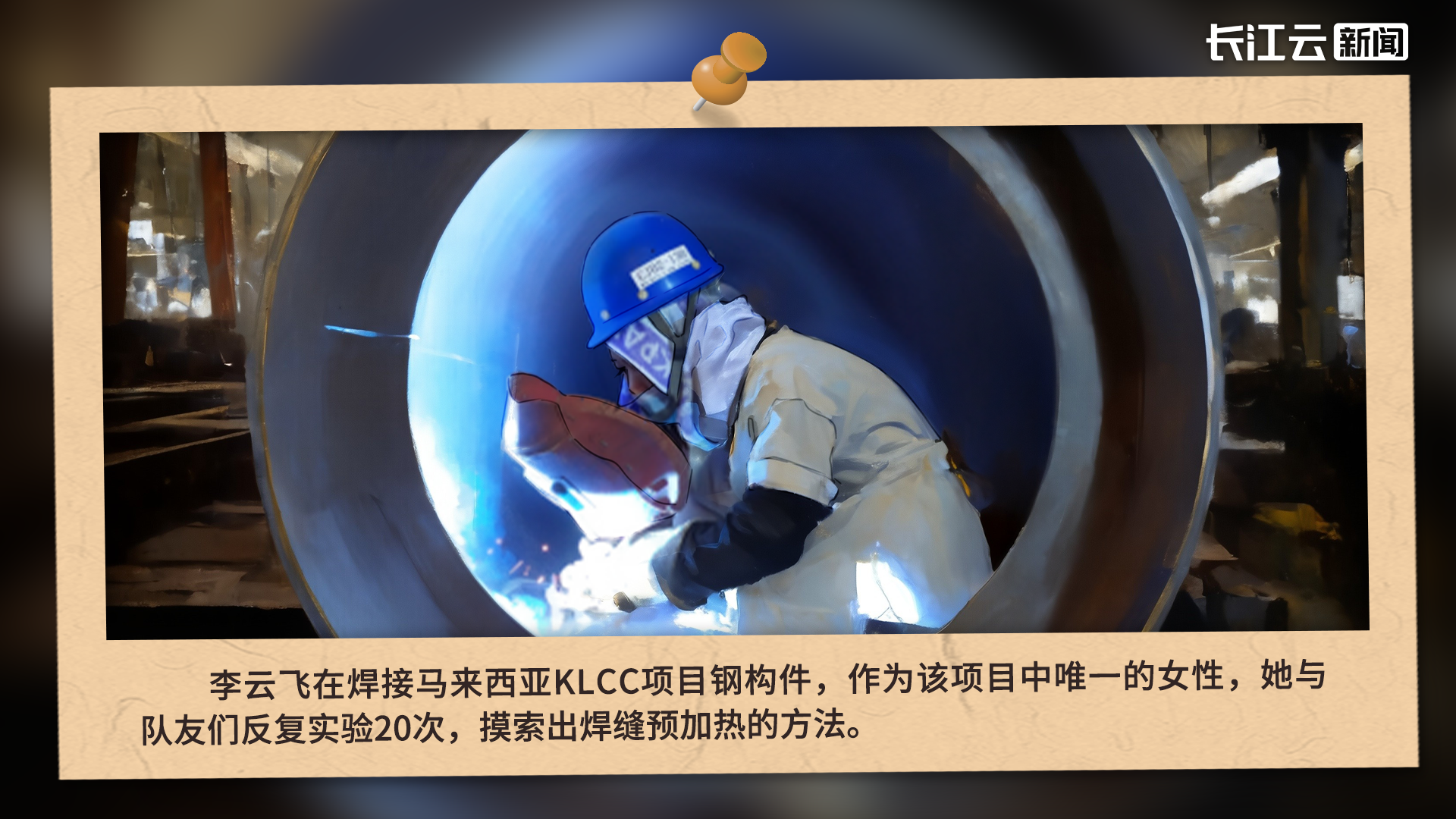 2022年,公司承接了马来西亚KLCC项目,面对200mm超厚板及S690超强钢焊接技术这一行业内世界性难题,李云飞所在的KLCC项目党员突击队挺身而出。作为其中唯一的女性,她与队友们反复实验20次,摸索出焊缝预加热的方法。“板材焊缝处要一直保持在100多度。人在腔内焊接,火枪在腔外炙烤,如同铁板烧。”在极端艰苦的条件下,李云飞和队友轮班上阵,历经半年多的艰苦奋战,一次总装焊接合格率达到98.5%以上,所有焊缝顺利通过国际检测,为中国焊接技术赢得了国际认可。