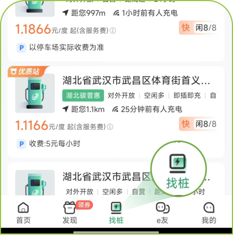 (1)e充电App首页的“找桩”按钮进入充电站列表栏