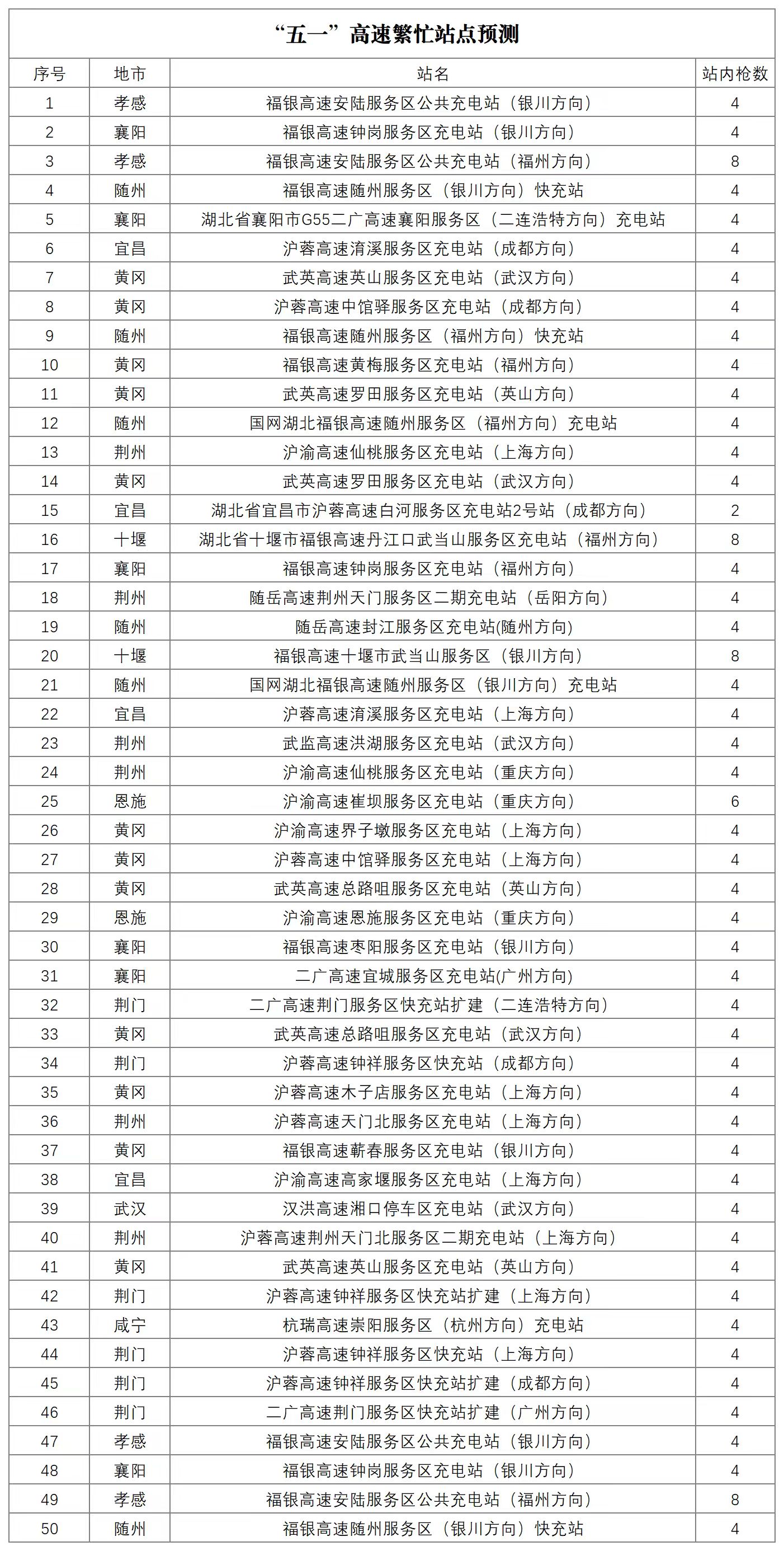 为帮助新能源车主合理安排假期高速出行及车辆充电,国网电动汽车湖北公司特地整理发布“五一”假期电动汽车高速出行充电指南,提示车主做好行程规划,尽量避开50个最“忙”充电站点。