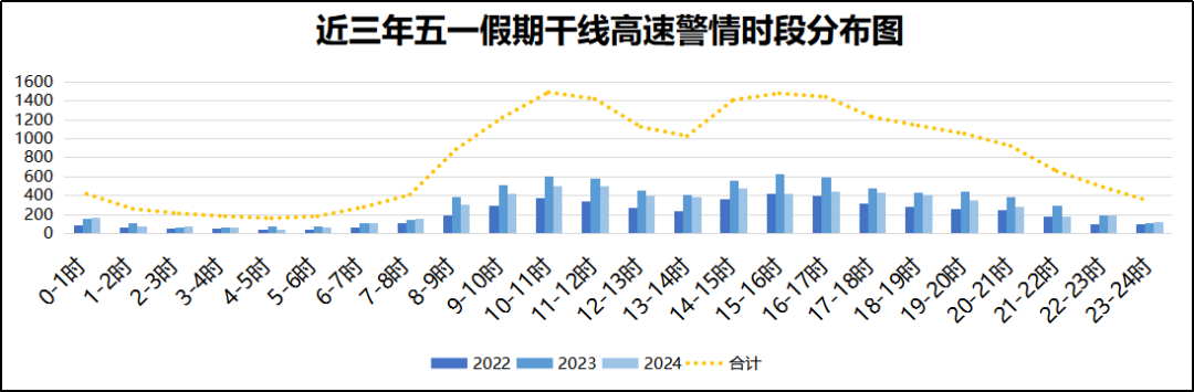 近三年“五一”假期,干线高速假期首日警情最多,每日高峰时段主要集中在9时至13时、14时至18时。