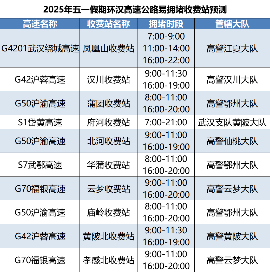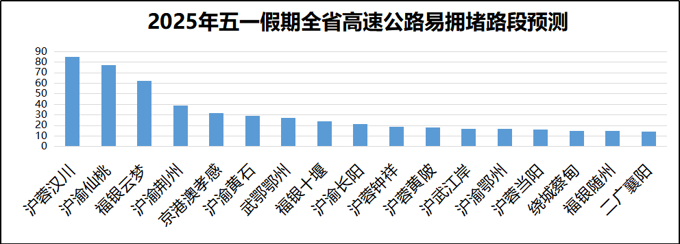 沪蓉高速汉川段,沪渝高速仙桃、荆州段,福银高速云梦段,京港澳高速孝感段等高速路段拥堵风险较高。