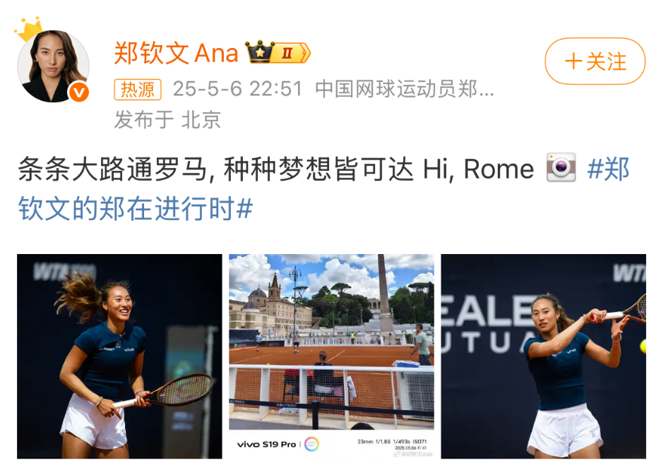 郑钦文罗马赛期间深夜发文:条条大路通罗马,种种梦想皆可达!