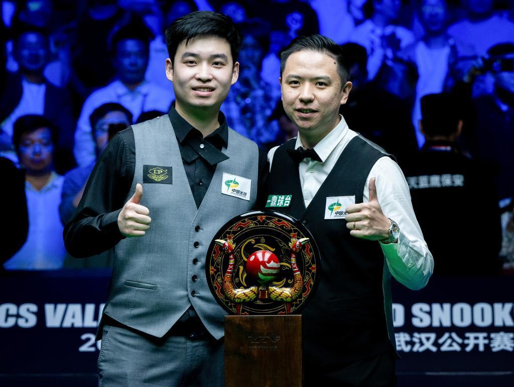 2024年10月12日,武汉斯诺克公开赛,冠军获得者肖国栋(右)在颁奖仪式上与另一位中国球手斯佳辉合影。新华社 摄