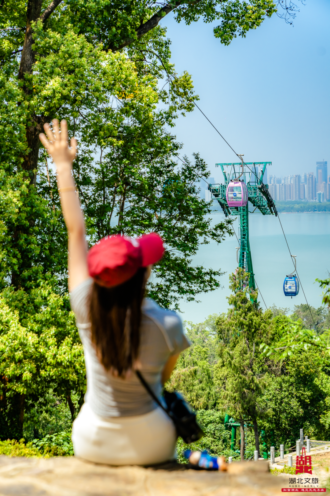 沿盘山路向上,千帆亭从树荫中探出一角,在亭前石阶回头望,视野豁然开朗,糖果色缆车点缀东湖湖面。