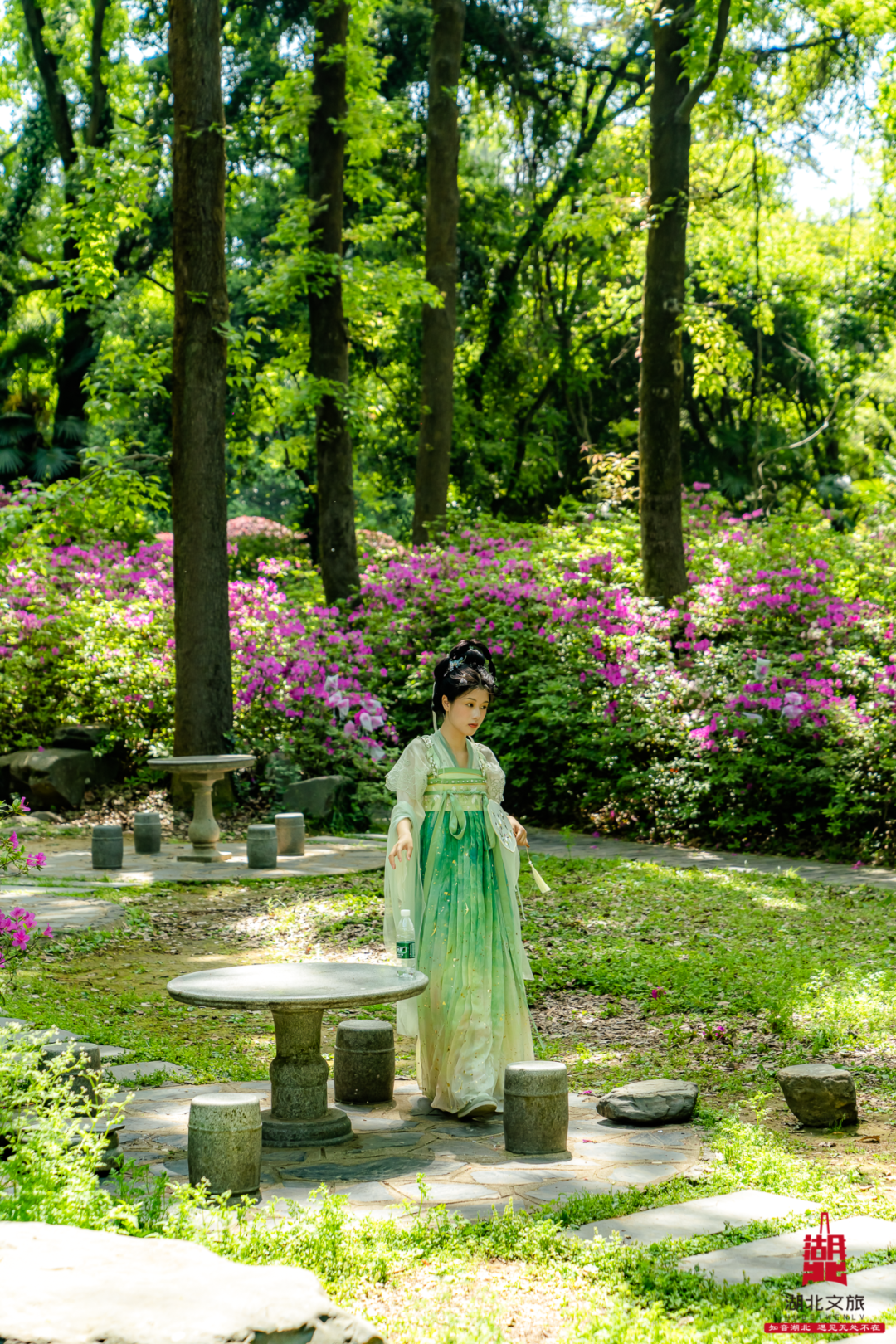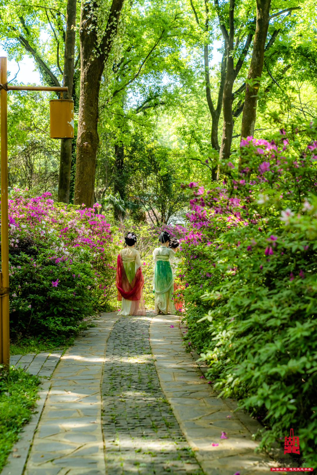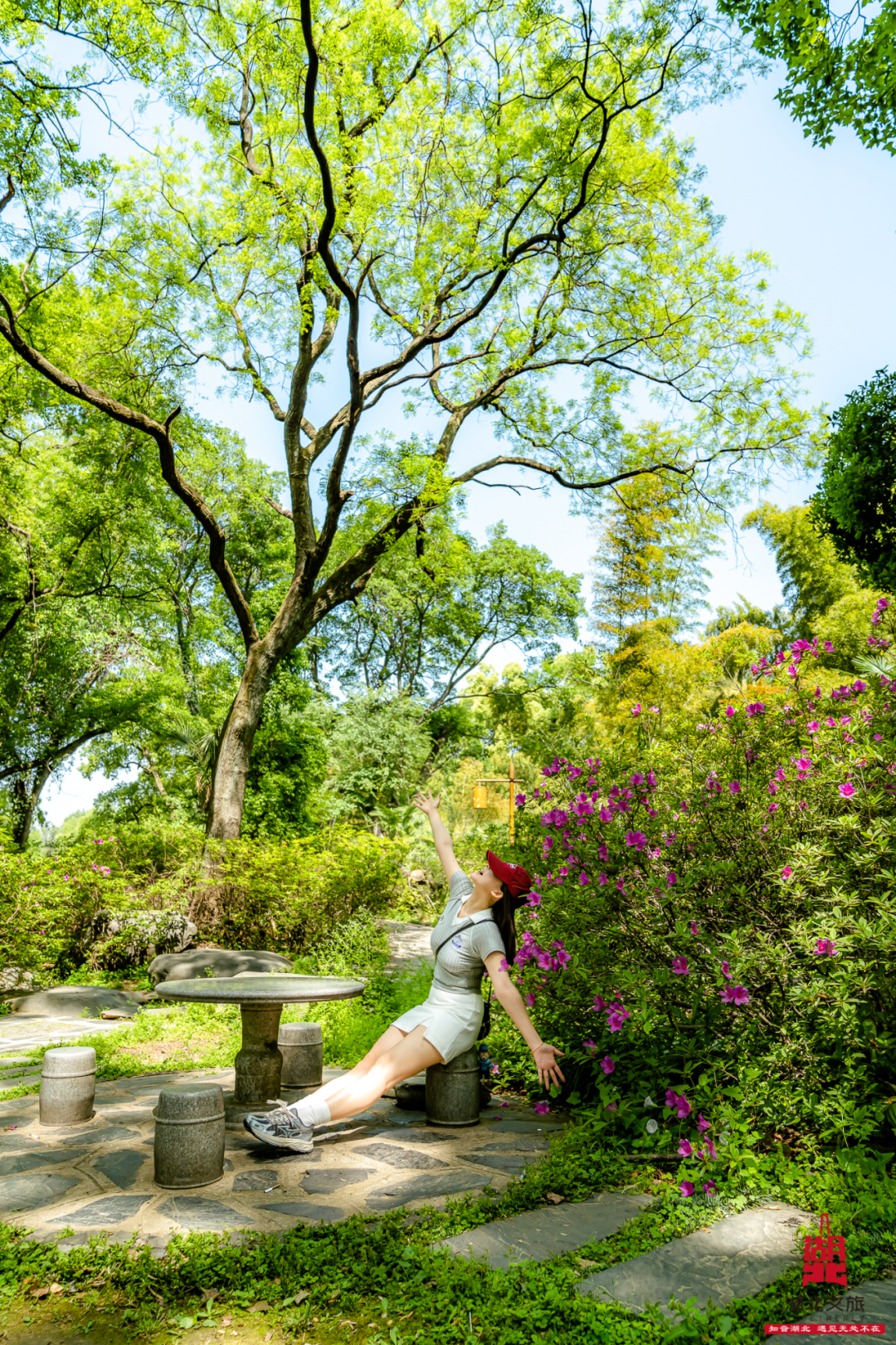 巨石尽头向右,窄路豁然开朗,一块空地被嫣红的杜鹃包围,这里就是杜鹃园,石桌石椅随意摆放,很有古意,适合汉服写真取景。