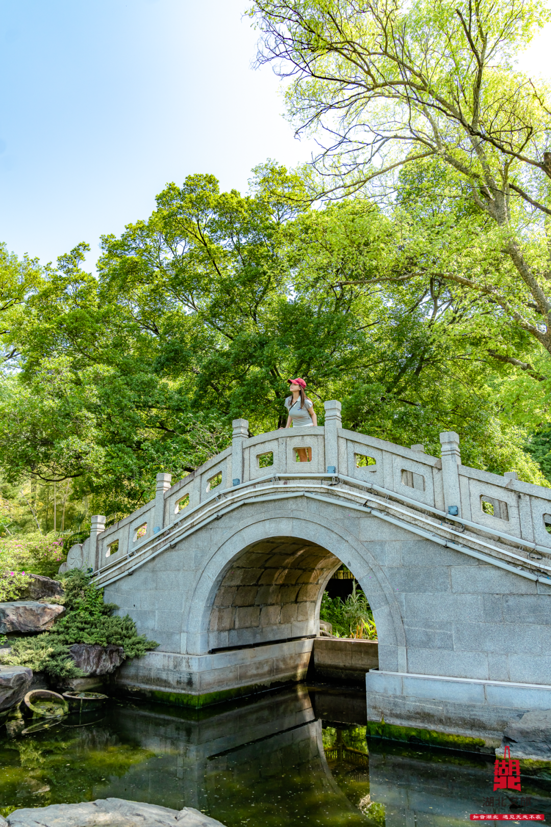 步行约600米,可以看到一片由绿色草坪、粼粼湖水、百年古树组成的小天地,一座石桥架于水面,这里就是映霞桥。