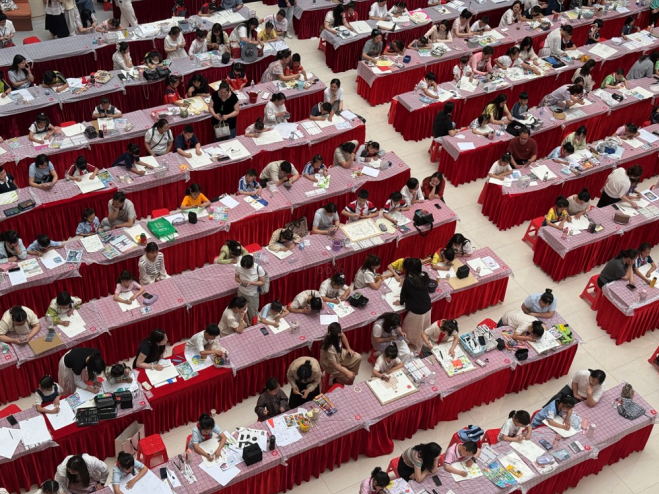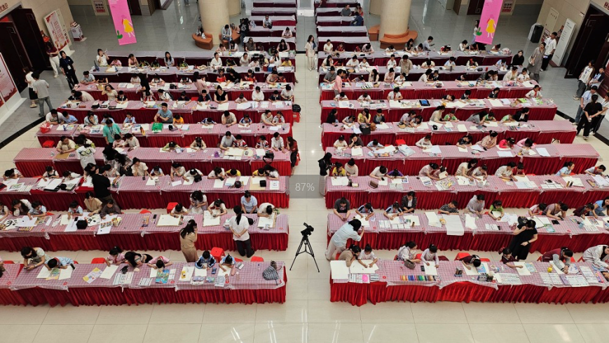 在创作区,一名学生正专注描绘潜山国家森林公园的秋日胜景:“我想把家乡的桂花林画进山水长卷里。”水彩组的同学则用画笔描绘桂花的花瓣,稚拙的笔触间尽显文化传承的生机。陪同参赛的家长张女士感慨:“这种高规格的现场赛事不仅锻炼孩子心理素质,更让他们深入理解家乡的文化底蕴。”