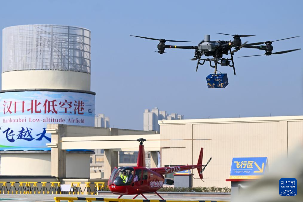 装配快递盒的无人机在汉口北低空港无人机停机坪起飞。新华社记者 肖艺九 摄