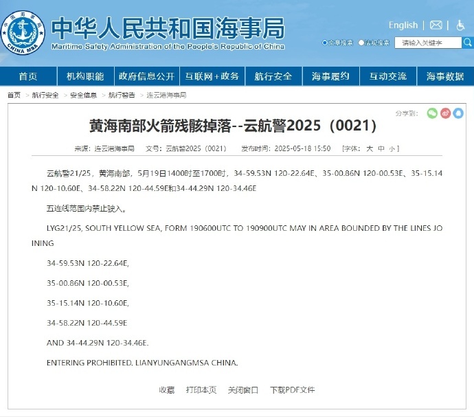 据中国海事局网站消息,连云港海事局发布航行警告,5月19日14时至17时,黄海南部火箭残骸掉落,禁止驶入。