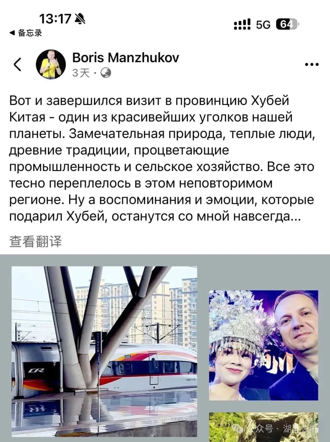 格鲁吉亚“镜头”电视台记者鲍里斯在乘坐高铁告别湖北之际,在Facebook上写下了这样一段话:中国湖北之行圆满结束,这里的景色无与伦比,有壮丽的自然风光、热情好客的人民、悠久的传统习俗和繁荣发达的工农业,所有的一切我将会铭记于心。