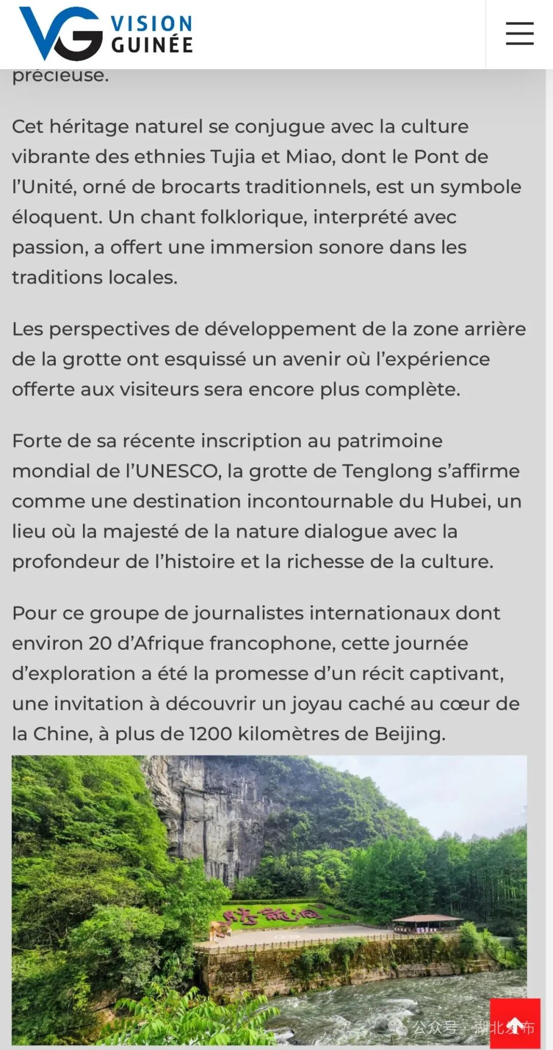 几内亚视觉网记者Diallo报道称,腾龙洞是奇绝山水承载千年文化底蕴,印证了它作为联合国教科文组织批准的世界地质公园的非凡价值。