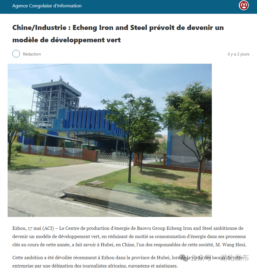 刚果(布)记者马桑巴两次在刚果通讯社发布报道介绍鄂钢,称其为“业内绿色发展标杆”,并写到:“这里颠覆了传统工厂的刻板印象——绿树成荫、鸟语花香,是工业与自然的完美共生!”