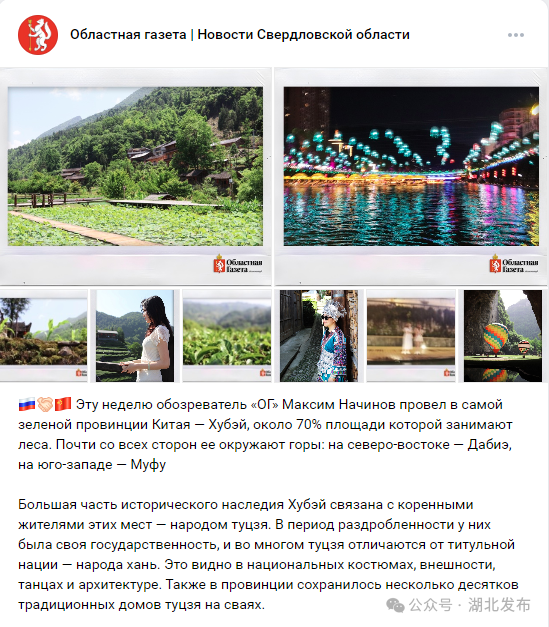 俄罗斯斯维尔德洛夫斯克州《州报》记者马克西姆在报道中这样形容湖北:参观游览中国湖北省,欣赏到了如画般的自然美景。如果说亚马逊森林是“地球之肺”,那么湖北可称作“中国之肺”。