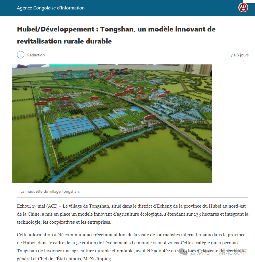 参观完鄂州峒山村后,刚果(布)记者马桑巴进行了专题报道,标题为《湖北/发展:峒山——可持续乡村振兴的创新模式》。文中提到,湖北省鄂州市峒山村通过提升植被覆盖率至43%、完善污水处理和垃圾分类,显著改善生态环境;建设现代化住宅区与公共服务设施,使农民享有城市的生活品质;打造生态露营基地等设施促进文旅融合,峒山村成为城乡融合发展的典型案例。