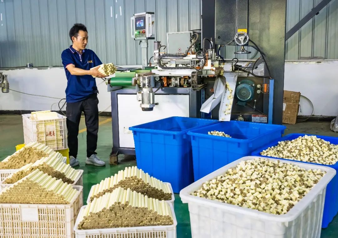 鲜艾草除了进入市场,还会被送入艾草深加工车间。车间里,工人们正将干艾叶送入压绒生产线,通过碾压、分离等工艺制成细腻的黄灰色艾绒。经过精准称重、卷制、定型等工序后,艾绒被转化为艾条、艾柱、艾香等产品。吴苏林表示:“艾叶经取、磨、挑、锤、筛五道工序后,可制成艾绒。艾灰用于足浴包,艾渣则作为饲料原料,实现资源全利用。”