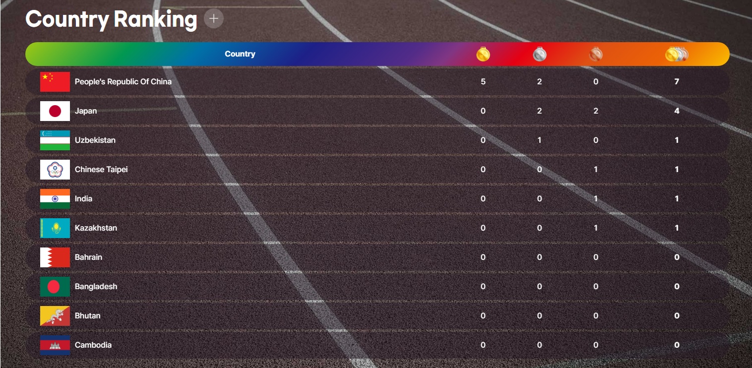 本届亚锦赛首个比赛日结束之后,中国队以5金2银的成绩高居奖牌榜首位。此外,梁小静、朱俊颖顺利闯入女子100米决赛,何锦櫶和王胜杰则跻身男子100米半决赛。刘英兰和段玉航也分别拿到了女子400米和男子跳高的决赛资格。男子10000米决赛中,于水庆以28分57秒39的成绩获得第5名,并刷新了个人最好成绩,另一名中国选手毛金虎位列第13。