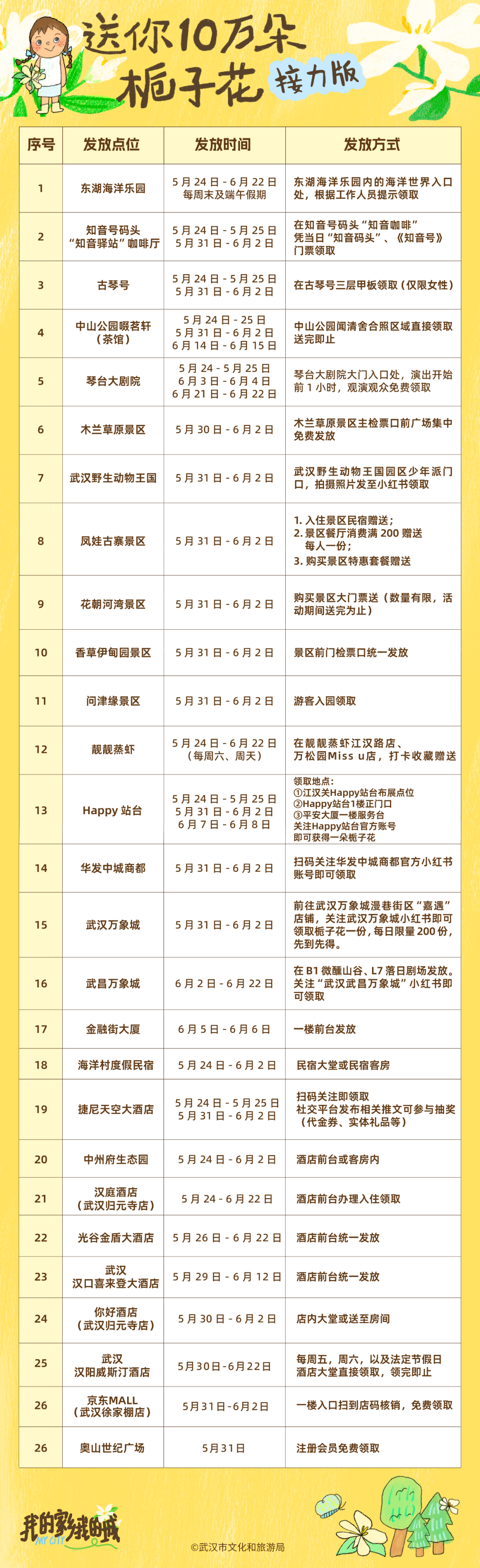 端午小长假,送花继续!在中山公园喝茶、在琴台大剧院看演出、在万松园嗦虾子……都能随机偶遇栀子花派送点。戳图片,看各点位领取方式↓