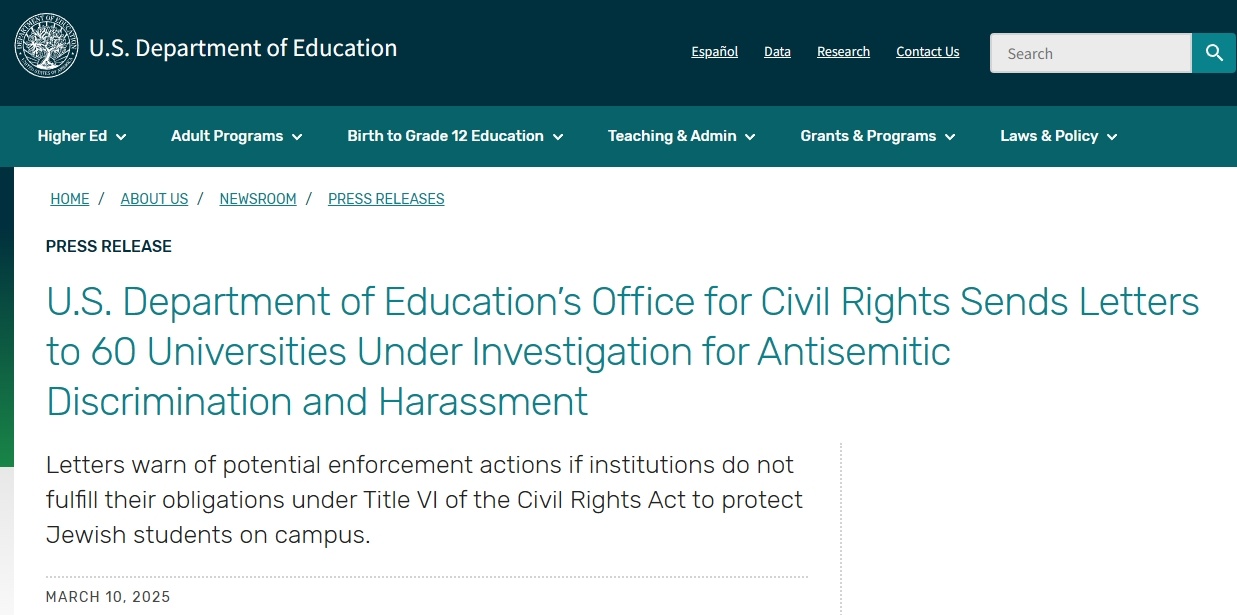 今年3月,美国教育部门向60所大学及其校区发送信件,警告他们要“保护犹太学生”,否则将“面临联邦执法行动”。这些校园包括了四个加州大学校园——圣地亚哥、圣塔芭芭拉、伯克利和戴维斯,以及南加州大学、波莫纳学院、斯坦福大学、钱普大学、圣莫尼卡学院和萨克拉门托州立大学。