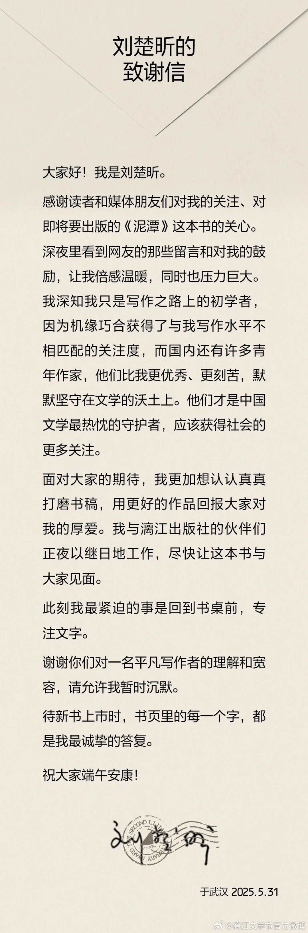 5月31日,刘楚昕通过@漓江文学节官方微博 写信回应网友: