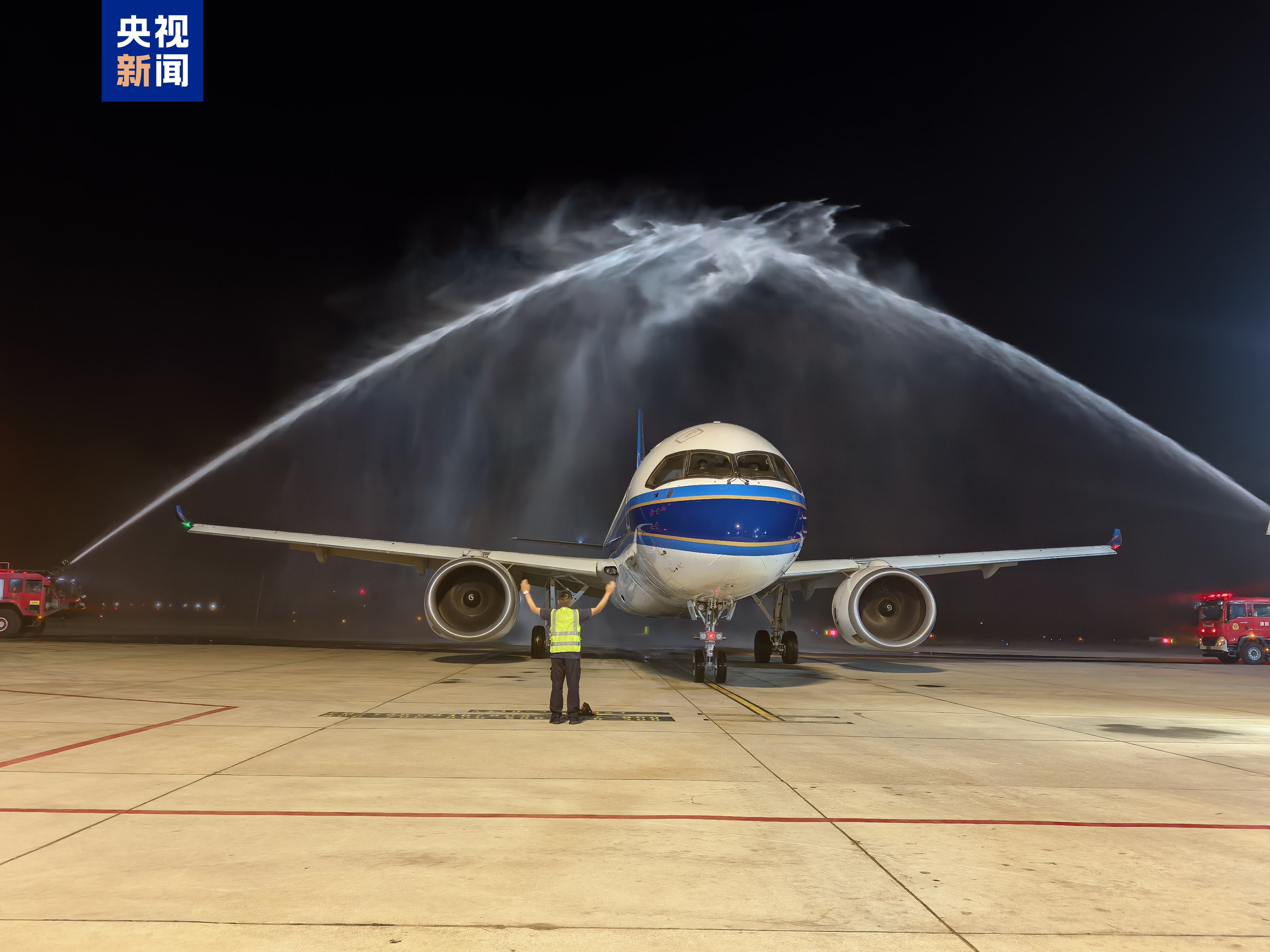 当地以象征民航最高礼仪的“水门礼”,迎接国产大飞机C919的首次到来。